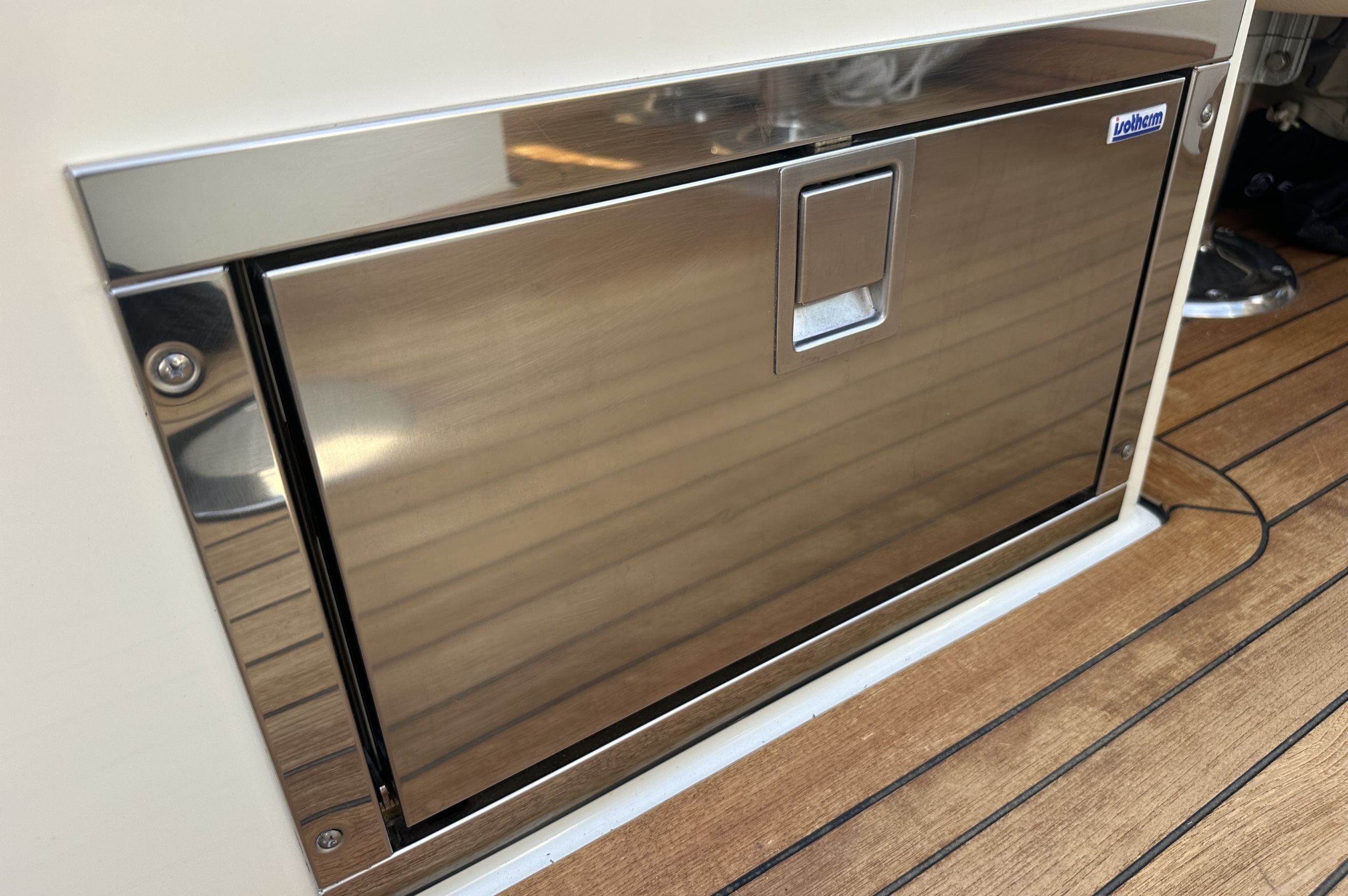 Teca na proa, poço e plataforma de banhos